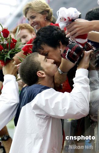 8月13日,美國(guó)游泳傳奇人物菲爾普斯,在北京奧運(yùn)會(huì)男子4乘200米自由泳接力中奪得自己奧運(yùn)會(huì)的第11枚金牌后,擁抱并親吻在“水立方”看臺(tái)上觀戰(zhàn)的媽媽黛比(Debbie)。 中新社發(fā) 杜洋 攝
