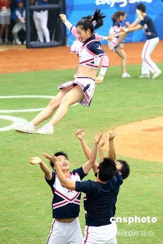 8月13日,2008北京奧運棒球賽在五棵松體育中心舉行,中場休息時大會安排啦啦隊表演熱鬧非常。中新社發 CNAsports 攝