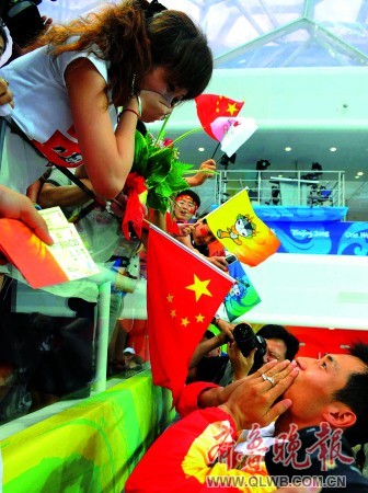 8月13日,北京奧運會跳水男子雙人三米板比賽頒獎儀式后,中國選手王峰從領獎臺上跑到看臺下,將手中的鮮花送給為他助陣的愛妻王丹后又獻上飛吻。(齊魯晚報/劉軍攝)
