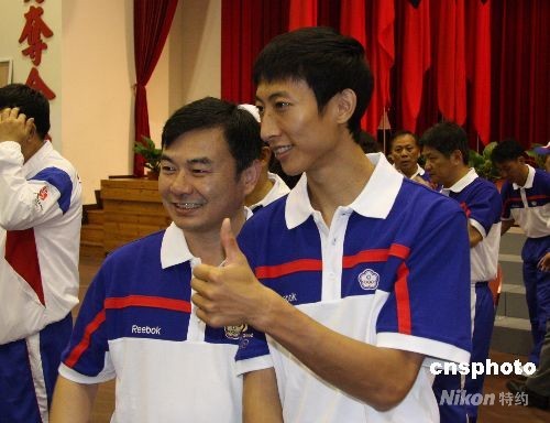 出征第二十九屆奧運會的中華臺北隊七月三十日在高雄左營運動選手訓練中心正式成軍。圖為跆拳道選手朱木炎與教練蔡明志在儀式舉行后合影。 中新社發 曾嘉 攝