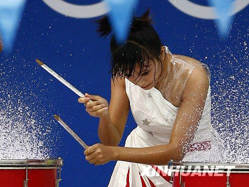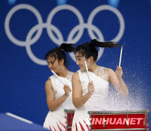8月16日,演員們?cè)谟斡颈荣愰_始前進(jìn)行水鼓表演。當(dāng)日,北京奧運(yùn)會(huì)游泳比賽繼續(xù)在國(guó)家游泳中心“水立方”舉行。 新華社記者費(fèi)茂華攝