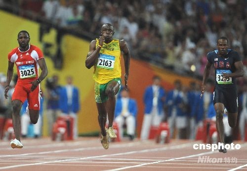 8月16日晚,牙買加選手尤塞恩·博爾特在中國國家體育場“鳥巢”進行的北京2008年第二十九屆奧運會男子100米決賽中,以9秒69的成績奪得金牌并打破9秒72的世界紀錄。中新社發 古玉 攝