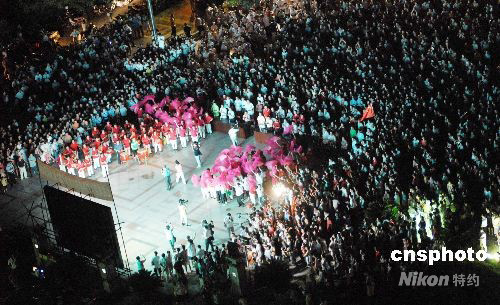8月17日晚,福建龍巖市上杭縣人民廣場上人山人海,在當日舉行的北京奧運羽毛球男單決賽中,世界排名第一的“超級丹”林丹終于完勝馬來西亞名將李宗偉奪冠,圓了自己的奧運金牌夢。中新社發 福建分社 攝
