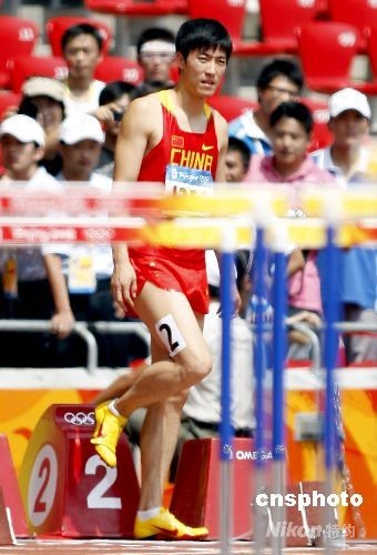 8月18日上午,在北京奧運(yùn)男子110米欄第1輪第6組比賽中,中國選手劉翔因腿傷遺憾退出比賽。中新社發(fā) 盛佳鵬 攝