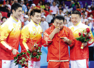 當(dāng)三位隊(duì)員戴上沉甸甸的金牌,王勵(lì)勤向臺(tái)下的人指了指,王皓、馬琳也急忙揮手,不一會(huì)劉國梁終于走上了頒獎(jiǎng)臺(tái),只見王皓與馬琳一左一右摟著劉國梁,然后隊(duì)員們紛紛摘下自己的金牌套在他的脖子上,中國男團(tuán)的眾志成城、團(tuán)結(jié)一心叫人印象深刻,他們所做的一切為的就是完成國人對于國球不變的期望。