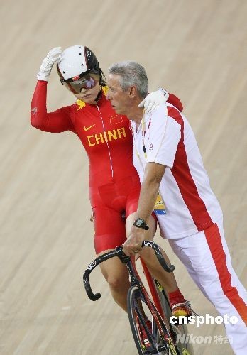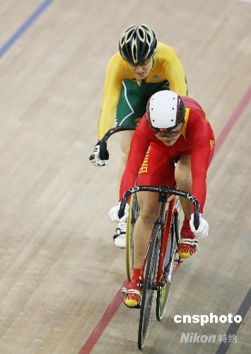 8月19日,2008北京奧運會場地自行車女子爭先賽半決賽在老山自行車館進行,中國自行車“希望之星”郭爽因第三戰決勝戰因為與對手米亞雷斯有身體接觸犯規被處罰取消成績,因此遭逆轉惜敗無緣決賽,只能與荷蘭選手卡尼斯爭奪銅牌。中新社發 武仲林 攝