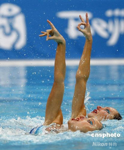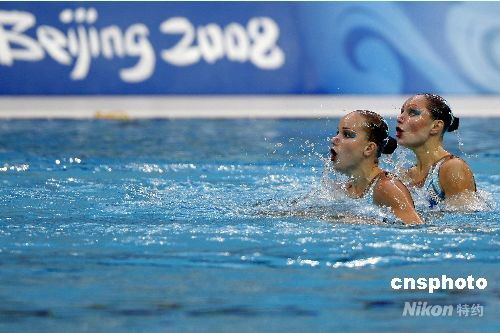 8月19日,2008北京奧運會花樣游泳雙人自由自選預賽在國家游泳中心“水立方”進行。衛冕冠軍俄羅斯組合達維多娃/葉爾馬科娃以98.834的總分遙遙領先排名首位。 中新社發 杜洋 攝