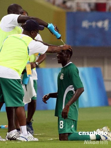 8月19日,北京奧運(yùn)會男足半決賽,尼日利亞以4:1大勝比利時(shí),晉級奧運(yùn)男足決賽。圖為尼日利亞球員用“洗頭”的方式來慶祝勝利。中新社發(fā) 湯彥俊 攝