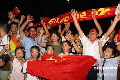 8月19日,江蘇常州市,陸春龍的父親陸建平(右三,臉上有國旗者)、母親倪如英(右六)和所住小區(qū)里的居民為陸春龍贏得北京奧運(yùn)會(huì)男子蹦床金牌歡呼。中新社發(fā) 胡平 攝