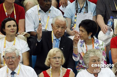 8月23日,國(guó)際奧委會(huì)終身名譽(yù)主席薩馬蘭奇,來(lái)到北京“水立方”觀看奧運(yùn)會(huì)花樣游泳集體項(xiàng)目決賽。 中新社發(fā) 杜洋 攝