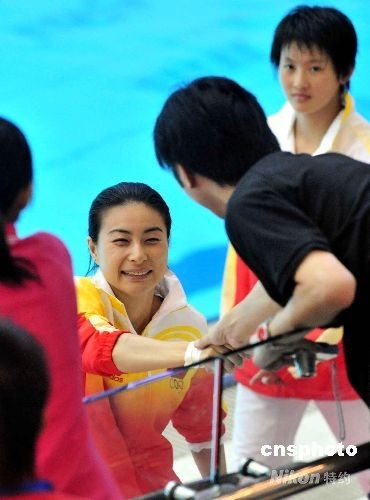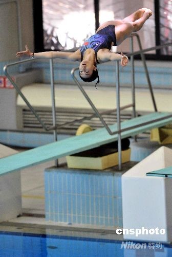 圖為郭晶晶示范三米板跳水。中新社發 譚達明 攝
