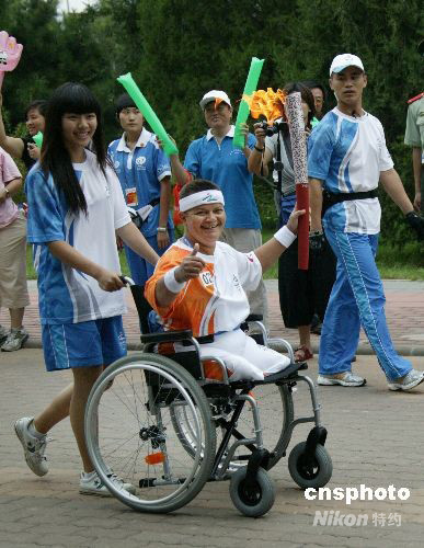9月6日,殘奧會火炬結束在北京的傳遞,參加火炬傳遞的殘疾人占火炬手五分之一。中外殘疾人火炬手在傳遞中成了亮麗的風景線,沿途觀眾為他們喝彩加油。 中新社發 馬毅行 攝
