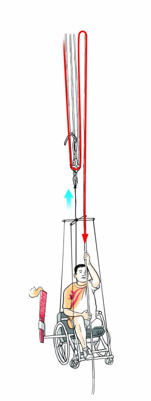 從地面到上面到主火炬塔邊緣大概30余米。100%靠人拉,上面有一組滑輪,這組滑輪替火炬手減少阻力。 新京報制圖/丁華勇