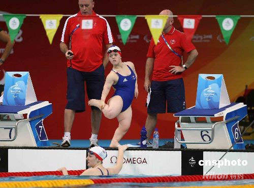 9月7日,北京殘奧會首日游泳比賽在“水立方”舉行,通過上午的預賽,晚間將產生16枚金牌。圖為參賽選手在下水前做準備活動。中新社發 任晨鳴 攝