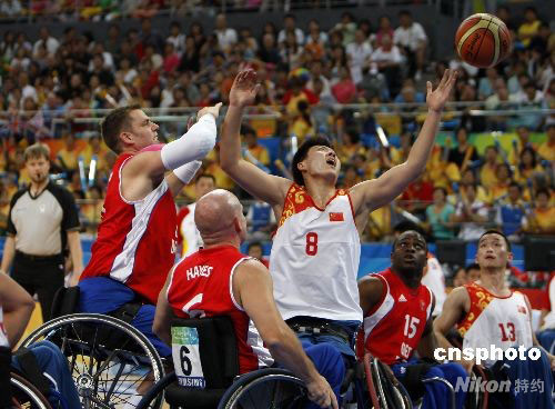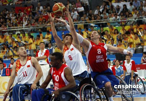 9月7日,北京殘奧會輪椅籃球比賽在北京國家體育館舉行,中國隊以34比81的比分不敵英國隊。中新社發 杜洋 攝