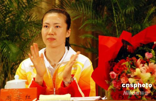 中國女排隊員周蘇紅在報告會上發言。 中新社發 楊慧峰 攝