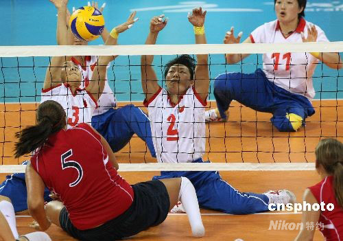 9月14日晚,北京殘奧會坐式女排決賽在北京的中國農業大學體育館舉行,雅典殘奧會冠軍中國隊以3:0戰勝美國隊蟬聯冠軍。 中新社發 任晨鳴 攝