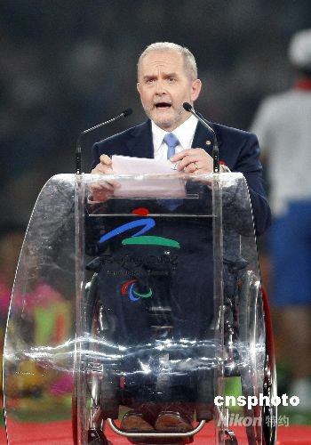 9月17日晚,北京2008年殘奧會閉幕式在國家體育場“鳥巢”舉行。國際殘奧委會主席克雷文致辭稱,這是有史以來最偉大的殘奧會。謝謝香港、謝謝青島,謝謝北京,謝謝中國。他宣布北京殘奧會閉幕。 中新社發(fā) 杜洋 攝