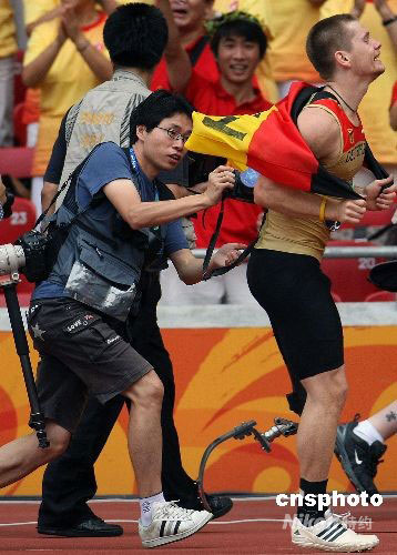 圖:德國選手“鳥巢”奪冠 與記者“賽跑”