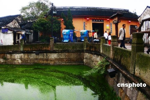 圖:浙江紹興王羲之故宅前墨池遭藍藻侵襲