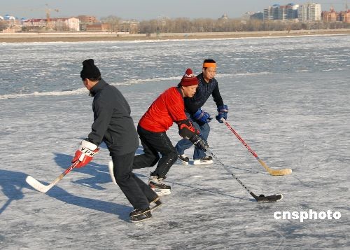 圖:冰球隊(duì)隊(duì)員在黑龍江上訓(xùn)練