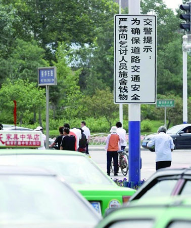 近來,在省城石家莊“迎賓大道”裕華路與建設(shè)大街交叉口,交管部門豎起的兩塊“新式”交通警示牌引發(fā)市民議論。“為確保道路交通安全,嚴(yán)禁向乞討人員施舍錢物”的警示語赫然入目,對此,記者在采訪中也聽到了社會各界的一些不同看法。