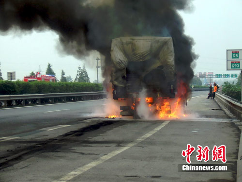 中新網(wǎng)德陽8月9日電 (王超) 9日下午15時50分左右,一輛寧夏牌照的大貨車在行駛至四川成都—綿陽高速德陽黃許鎮(zhèn)路段時,車身突然起火,導(dǎo)致車上裝載的20余噸硝硝酸銨(化肥)猛烈燃燒,濃煙彌漫,隨時都有爆炸危險,高速公路交通一度中斷。經(jīng)過德陽消防官兵緊張?zhí)幹茫K將險情排除,此次受阻2個多小時的交通隨后慢慢恢復(fù)。