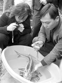 當(dāng)?shù)貪O政管理部門(mén)和水產(chǎn)保護(hù)大隊(duì)工作人員迅速趕到,經(jīng)觀察,初步認(rèn)定該魚(yú)是和中華鱘一樣珍貴的國(guó)家一級(jí)保護(hù)野生動(dòng)物達(dá)氏鱘,遂將該魚(yú)送到躉船漁艙喂養(yǎng),請(qǐng)有關(guān)專(zhuān)家作進(jìn)一步鑒定。