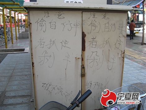 10月30日,記者在銀川市興慶區新華東街一電表箱上看到,有人用毛筆寫著“偷自行車者抓住剁手,誰不服試試”。