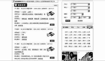 當然,像“紫漪”一樣的求職者們明白,條件越苛刻,意味著代價也越高。例如,一位指定在北京宣武、朝陽或崇文區工作,目標單位為中央電視臺或北京電視臺的應屆畢業生就慷慨地開出了5萬元的高價。另一位希望在南昌市公辦高校擔任正式講師、享受國家規定的福利及待遇的女碩士,也將賞金開到了5萬元。精明的職客網站甚至為此辟出一塊“高額懸賞”區,專門發布萬元以上的“懸賞令”。