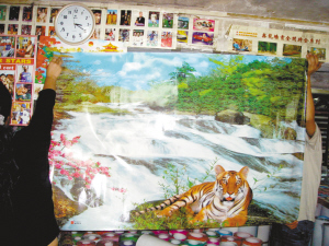 記者隨即趕到這家商店。店里的伙計從倉庫里面搬出50張已經落了灰塵的一卷年畫。展開一看,全部是一模一樣的《老虎臥瀑圖》。上面均印有“鑫龍墻畫”的商標和“TQ8301”的編碼。