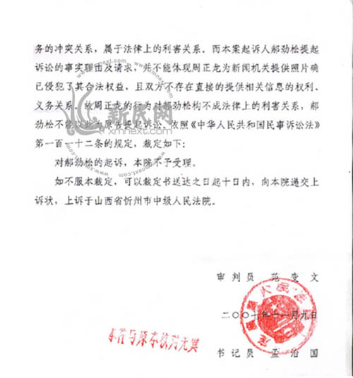 新民網從郝勁松提供的《山西省定襄縣人民法院民事裁定書》照片了解到,定襄法院不予受理的理由是:起訴人郝勁松提起訴訟的事實理由及請求,并不能體現周正龍為新聞機關提供照片確已侵犯了其合法權益,且雙方不存在直接的提供相關信息的權利、義務關系。故周正龍的行為對郝勁松構不成法律上的利害關系,郝勁松不能以此為原告提起訴訟。
