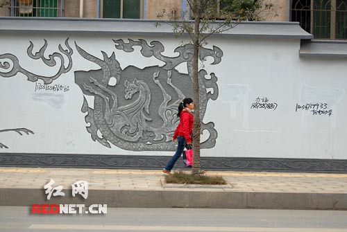 根據帖子提示,記者來到對接萬家麗路與瀏陽河西岸的營盤東路東段,在現場可以看到,圖片所拍文化墻實際上是湖南省教育廳北向的一面圍墻,圍墻用白底粉飾,上面依次分布近二十幅黑色浮雕圖案。站在馬路對面都能清楚看到,每兩幅圖之間的白底區域就有一個用黑色筆寫著的手機號碼,總共有近二十處。大多數寫著“辦證”,還有幾個明目張膽地注明為“黑車”或“貸款”。