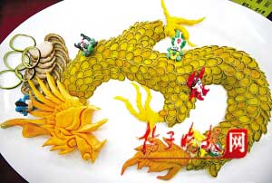 走進(jìn)展廳,記者就被展臺(tái)上的菜肴所吸引。在比“雕工”的展區(qū),南瓜、蘿卜、山芋等普通蔬菜被廚師們用妙手雕刻成龍、鳳、仙子等各色造型,刻工精細(xì),龍須、鳳尾上的羽毛,甚至是一根根的。已有10年廚齡的宋師傅告訴記者,作品里除了南瓜、還有紅、青蘿卜、山芋等食材,一共刻了三個(gè)小時(shí)才完工。在比“擺盤(pán)”的展區(qū),不少菜肴都是以?shī)W運(yùn)為主題,用面條搭建的“鳥(niǎo)巢”體育場(chǎng),形象逼真。用白色白玉糕、綠色麥香糕、糯米元宵擺出的五環(huán)體育場(chǎng)惟妙惟肖,“操場(chǎng)”外五位用糯米做的福娃更是可愛(ài)喜人,據(jù)介紹,從蒸糕點(diǎn)到擺盤(pán),廚師一共花了九小時(shí)呢,香噴噴的米糕看著都眼饞。