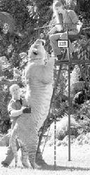 該動物園內的一只成年獅虎獸“赫拉克勒斯”目前已經長到3.7米長,體重超過了500公斤!當動物園的馴獸師奇娜·約克給“赫拉克勒斯”喂食時,盡管她站在了一個4米多高的支架上,但“赫拉克勒斯”仍輕易地站起了整個身子,并抓取到了奇娜手中的食物。雖然美國邁阿密稀有瀕危物種協會的環保專家布哈加文·安特爾博士仍勇敢地站在它身邊,但安特爾的身高只有“赫拉克勒斯”的一半。