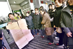 昨日中午1時許,兩名男子和一名婦女來到儲蓄所門前,高舉一個寫有“我在這里取到假錢”的紙牌子。舉牌子的男子叫汪登渝,長壽人,是進城務工的農民工。“我昨天中午在這取了5000元準備借給小舅子,半小時后我們走到家樂福后發現錢是假的。”汪說,當時他在自動取款機上分三次取錢(前兩次各取2000元,第三次取1000元),點清數額后將現金和卡帶離儲蓄所,隨后來到家樂福買東西時發現異常,“我看到錢上的頭像是黃色的,就覺得有問題。”汪的小舅子黃先生說。不過,對于汪登渝半小時內的行程,只有其小舅子能夠作證。