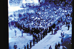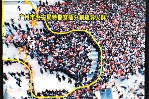 鏡頭:如同鐵板一塊的人群中,數支深色“箭頭”直插進去。這些都是廣州特警,他們手拉手,傾力擠進人群,十幾分鐘后,神奇般出現了一塊塊空地。