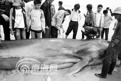 11日上午,記者在潮灘港海灘上見到了這條鯨魚,它軀體龐大,全身呈黑青色。省海洋與漁業(yè)廳、文昌市海洋與漁業(yè)局的有關專家,以及錦山鎮(zhèn)政府的工作人員已經(jīng)趕到現(xiàn)場。很多居民沒有見過鯨魚,紛紛前去觀看。據(jù)介紹,死亡的鯨魚是一頭須鯨,鯨魚頭寬1.3米,身長7.6米,重4500斤,屬幼鯨。