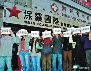 4月3日,近百名市民自發(fā)來到保羅國際門前,聲討“黑店”宰客,打出橫幅 “反對天價頭”,多個網(wǎng)友在保羅國際門前打出“很黑很后臺”的標(biāo)語。在市民沸沸揚揚的聲討中,4月3日下午,鄭州工商部門終于作出決定,限令“保羅國際”立刻停業(yè)整頓;4月5日,鄭州市二七區(qū)物價局對其作出罰款50萬元的行政處罰。