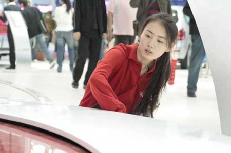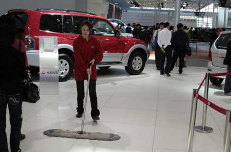 接下來的事情讓攝影者幾乎落淚:清潔妹妹在為輪胎拋光,當時展臺上的模特正在走秀,臺下很多專業的攝影家們在忘我地拍攝著,她蹲著從底下擦過來的時候,似乎阻擋了他們的創作,一個攝影家為了捕捉到那珍貴的大腿,沖上來,伸出大手拉了她衣服領子一下,她趔趄了一下,然后很不好意思地躲開了,從照片上看,妹妹仍然盡職地擦著車,但緊閉的雙眼、微蹙的眉頭讓人能一眼看出,她心里很不好受,這張楚楚可憐的照片,令人對其頓生同情和憐愛。