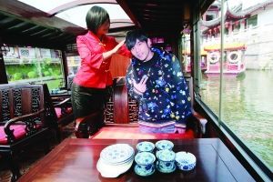 “杰倫號”上最特別的就是一幅與杰倫同比例的大幅紙質(zhì)模特,笑容滿面地坐在原來杰倫坐的位置上,前面的茶幾上還放著杰倫品嘗過的狀元豆、雨花茶。據(jù)稱,這個(gè)“模特”可以供游人照相。