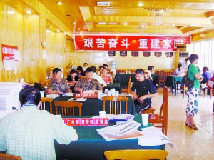 在餐廳一角,堆放著不少單位的標牌,這些單位還沒有在辦事處設(shè)點。“有的是實在抽不出人,還有的根本沒法派人來。”宣傳部一位工作人員介紹,有些單位在地震后就完全沒有人了,“太慘了”。