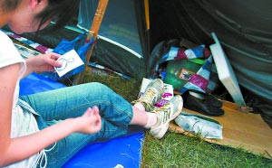 唐家山上的“一盆兒水”鬧得下游綿陽(yáng)城的居民紛紛抱著家當(dāng)上了山。“背井離鄉(xiāng)”本是件“苦活兒”,但什么事兒到了天性豁達(dá)的四川人那里,卻總能找出樂(lè)子來(lái)。