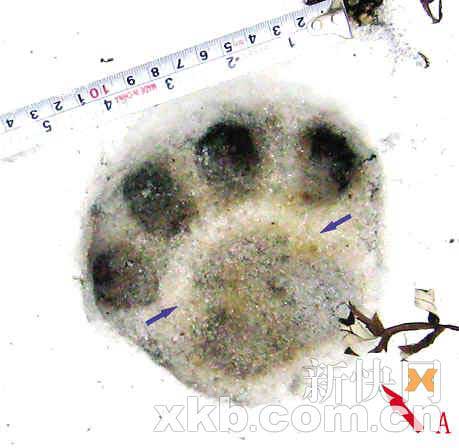 劉里遠對此也作了解釋:從照片(見圖)可見前面那四個腳趾都不同程度地向前凹進。這是因為老虎在抬腳時,先抬起腳跟和腳掌,并且整個身體向前移動,則其腳趾尖在雪中向前推進,形成那樣的內(nèi)突凹陷。另外,我們還看到腳印的前沿有一明顯的缺口,顯然是虎腳最后離開時拖拽而成。劉認為這是一個典型的行進中的老虎腳印,幾乎是不可能人工模擬出來的。
