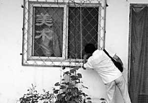 昨日,一男子向美術教室內張望,張某租用簡易樓開辦的美術班已大門緊鎖。張某因涉嫌猥褻8歲女孩被警方控制。記者田北北 攝