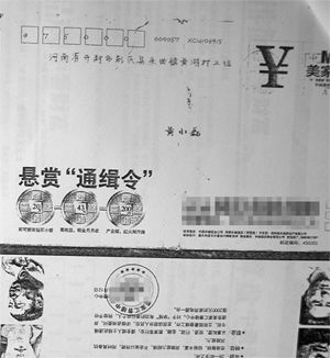 進門后,黃明華看到二老呆坐著,手里拿著“通緝令”。他打開信封,里面其實是鄭州一家房地產公司的廣告。上面寫著“懸賞通緝”,左右兩側分別有3個人頭素描,“很像通緝犯”。
