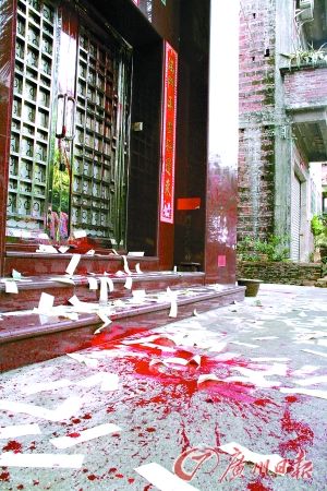 昨日(10)凌晨,佛山市順德區新隆村村主任陳某的宅所遭襲。陳宅的大門被人用鐵鏈反鎖,并澆滿紅油漆,肇事者臨走前,還在門口點起了白蠟燭,撒下了大量冥幣和紙錢。