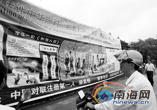 叫賣(mài)對(duì)聯(lián)版權(quán)的人叫梁其恒,?谑协偵絽^(qū)甲子鎮(zhèn)人。梁其恒告訴記者:“近幾年,農(nóng)村的變化很大,農(nóng)民的生活水平也有了很大提高。自從瓊山合并到海口后,海口市委市政府對(duì)農(nóng)民的生活很重視,相繼解決了農(nóng)民喝水難、行路難等問(wèn)題。農(nóng)村合作醫(yī)療以及減免義務(wù)教育階段學(xué)生學(xué)雜費(fèi)、課本費(fèi)等政策,使農(nóng)民看病更容易了,醫(yī)藥費(fèi)也更便宜了,孩子們都上得起學(xué)了?吹竭@一切,梁其恒對(duì)黨和政府充滿了感激之情,開(kāi)始尋思著利用一種形式把這種感激之情表達(dá)出來(lái)。最后,他選擇了創(chuàng)作對(duì)聯(lián)。據(jù)梁其恒介紹,他從2003年3月開(kāi)始構(gòu)思,前后花了兩年多時(shí)間,不斷修改創(chuàng)新,終于于2005年12月份完成了對(duì)聯(lián)《和諧人間》的創(chuàng)作(上聯(lián):錦繡中華與時(shí)俱進(jìn);下聯(lián):濤瀛神州繼往開(kāi)來(lái);橫聯(lián):和諧人間)!逗椭C人間》創(chuàng)作完成后,梁其恒邀請(qǐng)了海南知名的書(shū)法家書(shū)寫(xiě)文字,并自費(fèi)印刷了幾百份,在親戚朋友間發(fā)放。梁其恒說(shuō),親戚和朋友們對(duì)他的對(duì)聯(lián)都很喜歡,還有許多臨高、瓊海等地的外地人也慕名而來(lái),甚至還有人自愿掏錢(qián)購(gòu)買(mǎi)他的對(duì)聯(lián)。