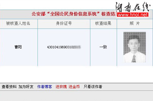 不少網友根據已有信息開展“人肉搜索”,據網友“追尋者”提供的信息顯示,該男子系岳陽市人大代表,69年出生,名叫曹陽。一名網友更利用公安部新近開通的“全國公民身份信息系統”將曹姓男子的身份證照片搜索出來并貼到網上。還有山東棗莊的網友提供了嫌疑男子的手機號碼及詳細住址,網友半信半疑,有網友更是試圖撥打號碼,但無法接通。