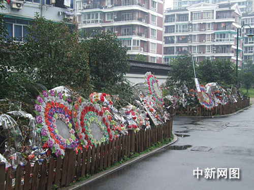 11月5日,記者看到,杭州新星實業有限公司前面近300平方米的空地仍舊被圍墻圍著,圍墻外面則擺滿了花圈,而這道圍墻,就是小區居民與陳連榮之間的導火索。